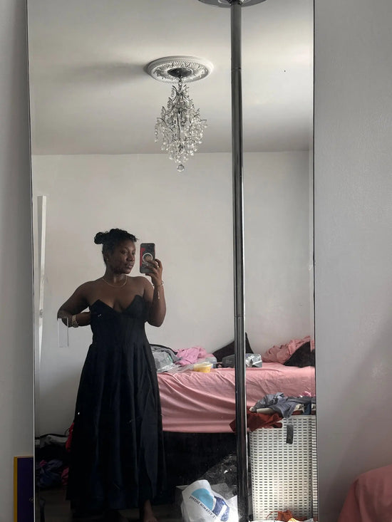 Det finns lager på lager av tyg under kjolen för att bibehålla den perfekta formen och den stängs baktill för enkel påklädning.